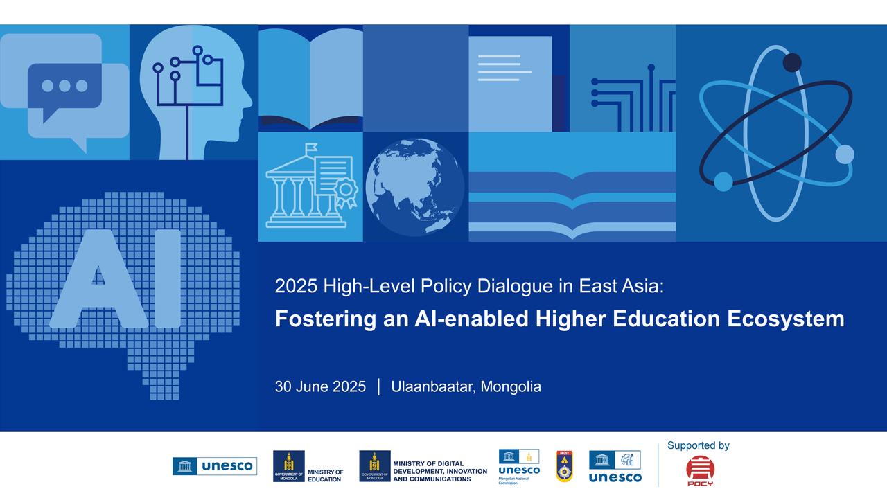 Themed 'Fostering an AI-enabled Higher Education Ecosystem', the 2025 High-Level Policy Dialogue in East Asia will be held in Ulaanbaatar, Mongolia, on 30 June 2025. The event is co-organised by UNESCO Regional Office for East Asia (UNESCO Beijing), the Ministry of Education of Mongolia, Ministry of Digital Development, Innovation and Communications of Mongolia, Mongolian National Commission for UNESCO (MNCU), Mongolian University of Science and Technology (MUST, IIOE Mongolia National Centre), and the International Centre for Higher Education Innovation under the auspices of UNESCO (UNESCO-ICHEI), with the support of China Pocy Group Co., Ltd. The event will gather higher education stakeholders in the region and beyond, to collectively explore the opportunities and challenges that artificial intelligence (AI) technologies bring to local higher education systems, analyse specific needs and challenges, and to demonstrate promising cases of AI application in higher education. The event also serves as a bridge to facilitate industry-academia and multilateral. As part of the event, UNESCO and UNESCO-ICHEI will unveil several significant programme outcomes, supporting the digital transformation of higher education across the region.