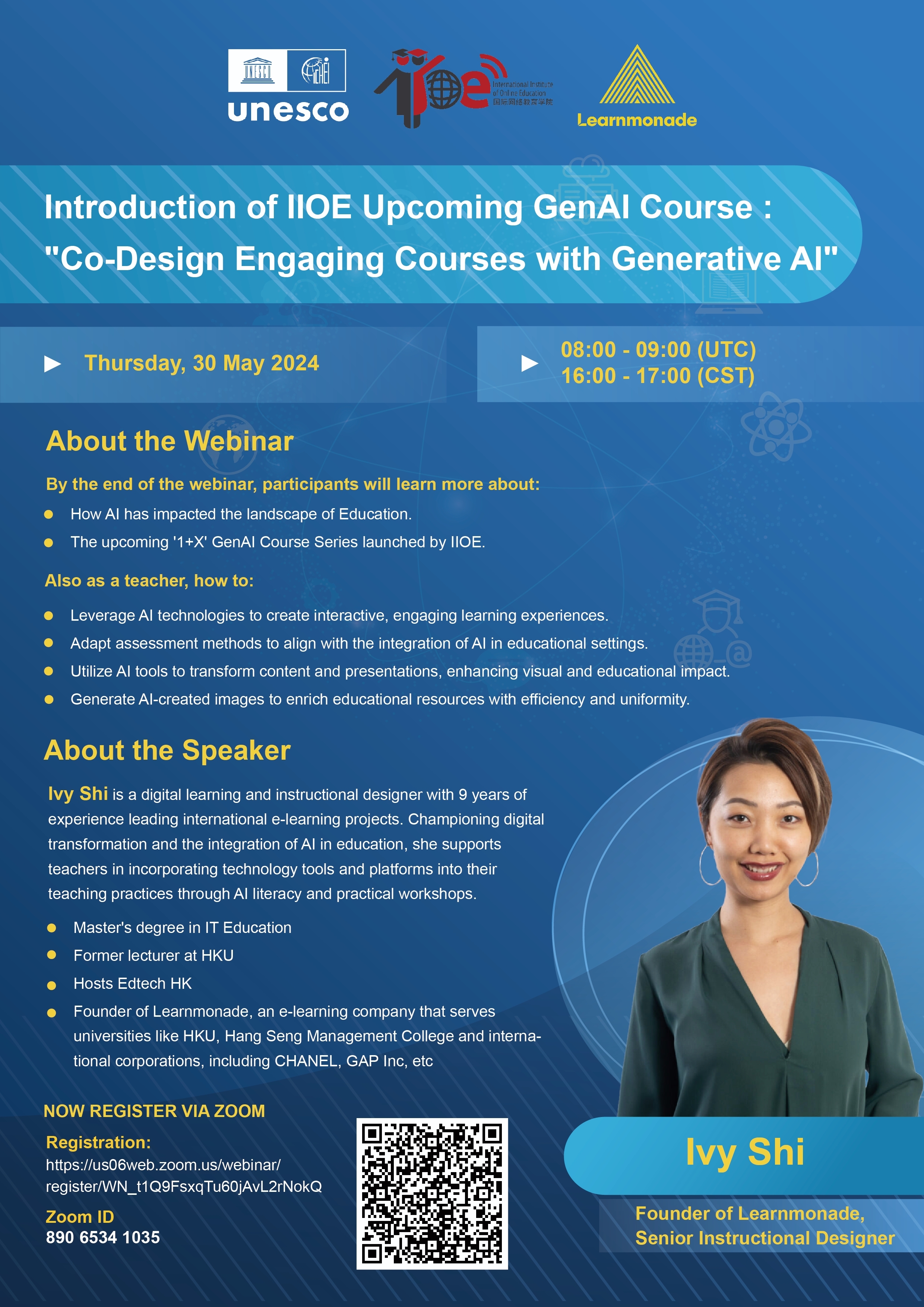 With the rapid development and widespread application of generative artificial intelligence (AI) technology, the field of education is witnessing unprecedented opportunities and challenges. To explore how to effectively utilize this cutting-edge technology in teaching, we are pleased to invite Ivy Shi, founder and senior instructional designer of Learnmonade, as the keynote speaker for the webinar themed "Co-Design Engaging Courses with Generative AI", scheduled for May 30, 2024. She will share insights into how generative AI is transforming the education sector and discuss practical strategies and methods to help educators enhance teaching quality and create interactive and engaging learning experiences.
