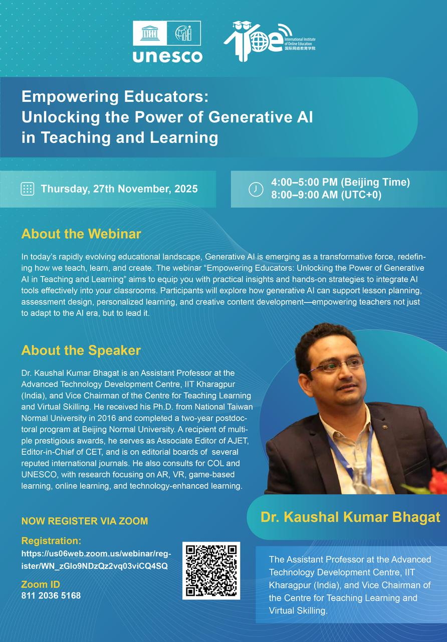 About the Speaker Dr. Kaushal Kumar Bhagat is an Assistant Professor at the Advanced Technology Development Centre, IIT Kharagpur (India), and Vice Chairman of the Centre for Teaching Learning and Virtual Skilling. He received his Ph.D. from National Taiwan Normal University in 2016 and completed a two-year postdoctoral program at Beijing Normal University. A recipient of multiple prestigious awards, he serves as Associate Editor of AJET, Editor-in-Chief of CET, and is on editorial boards of several reputed international journals. He also consults for COL and UNESCO, with research focusing on AR, VR, game-based learning, online learning, and technology-enhanced learning. What You Will Learn Practical generative AI tools tailored for key teaching scenarios, including lesson planning, assessment design, and personalized learning. Step-by-step strategies to seamlessly integrate AI into classrooms without compromising pedagogical quality. Methods to leverage AI for creative content development that engages students and enriches learning experiences. Insights to balance AI usage with hands-on teaching, avoiding over-reliance while maximizing efficiency. Event Information Date: Thursday, 27 November 2025 Time: 16:00–17:00 (Beijing) / 08:00–09:00 (UTC) Language: English Registration: https://us06web.zoom.us/webinar/register/WN_zGlo9NDzQz2vq03viCQ4SQ ZOOM ID: 811 2036 5168