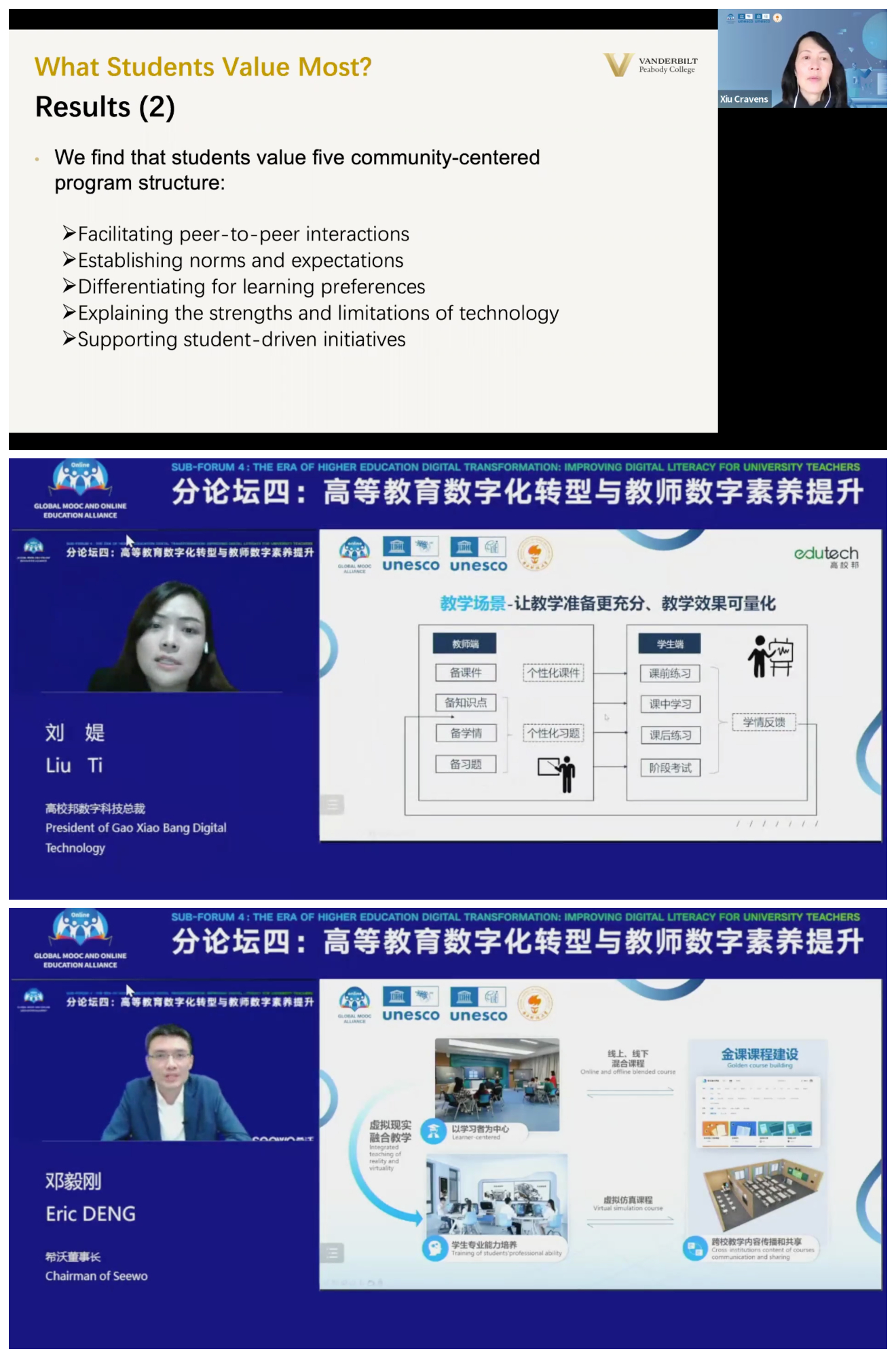 In the Roundtable Forum, Prof. Xiu Cravens, from the Department of Leadership, Policy, and Organizations, Peabody College of Education, Vanderbilt University, Ms. LlU Ti, President of Gao Xiao Bang Digital Technology and Mr. Eric DENG, Chairman of Seewo had an in-depth discussion on the topic of capacity building of digital teaching for university teachers. Starting from their own work experience and practical experience, they have carried out rich thinking on how to build the digital teaching capacity of university teachers, and have discussed the impact of digital technology development on the higher education ecology based on specific cases and data.