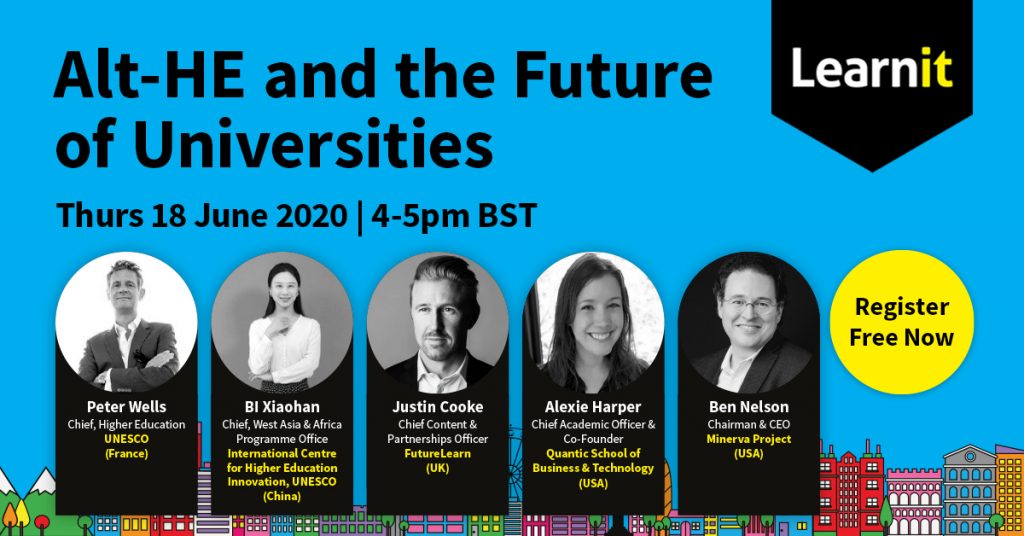 On June 18th, Alternative Higher Education the Future of Universities global dialogue was held online. This virtual dialogue was organized by Learnit, convened higher education players who have upended one or more parts of the traditional model.UNESCO-ICHEI was invited to attend this dialogue for its devotion to promoting ICT-driven higher education innovation in developing countries. BI Xiaohan, Chief of the West Asia Africa Programme Office from UNESCO-ICHEI, joined as panelist, together with Ben Nelson, Chairman CEO of the Minerva Project and Minerva Schools at KGI; Alexie Harper, Chief Academic Officer Co-Founder of the Quantic School of Business Technology, and Justin Cooke, Chief Content Partnerships Officer for FutureLearn. Peter Wells, Chief of Higher Education for UNESCO, expert moderator, presided over the meeting.