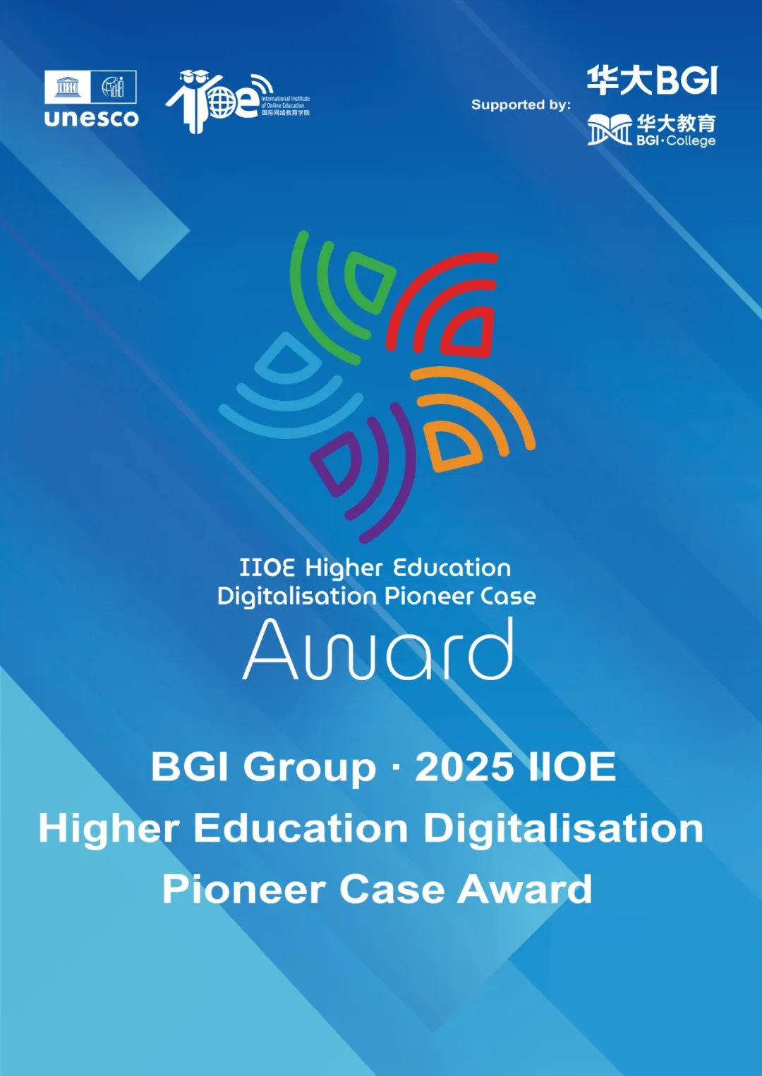 The "2025 IIOE Higher Education Digitalisation Pioneer Case Award" has been officially sponsored by BGI Group, with the branding name of the award being "BGI Group · 2025 IIOE Higher Education Digitalisation Pioneer Case Award" to express the appreciation of the International Centre for Higher Education Innovation under the auspices of UNESCO (Shenzhen, China) (hereinafter referred to as "UNESCO-ICHEI"). The sponsorship of the award is a living demonstration of BGI Group's continuous support of UNESCO-ICHEI and its contribution to the digital development of higher education.