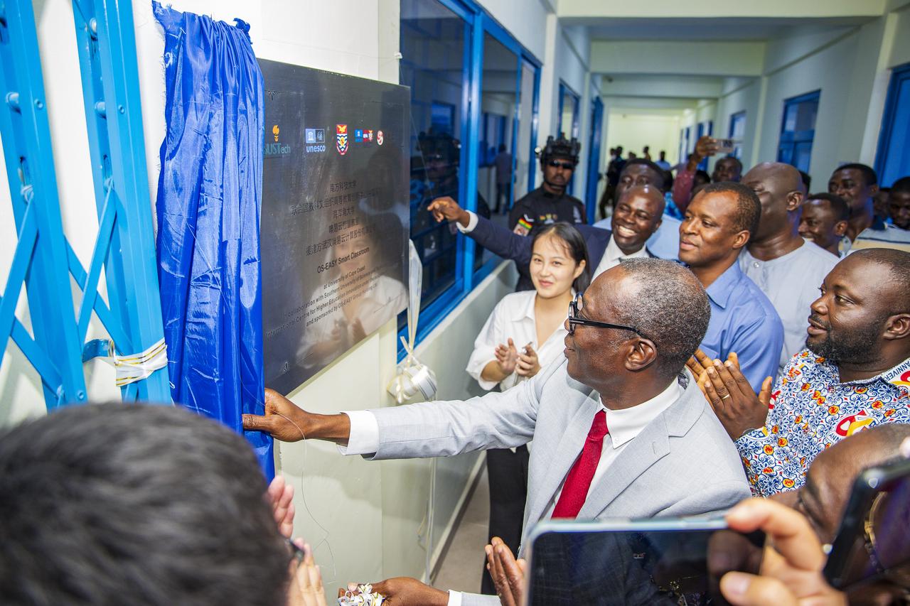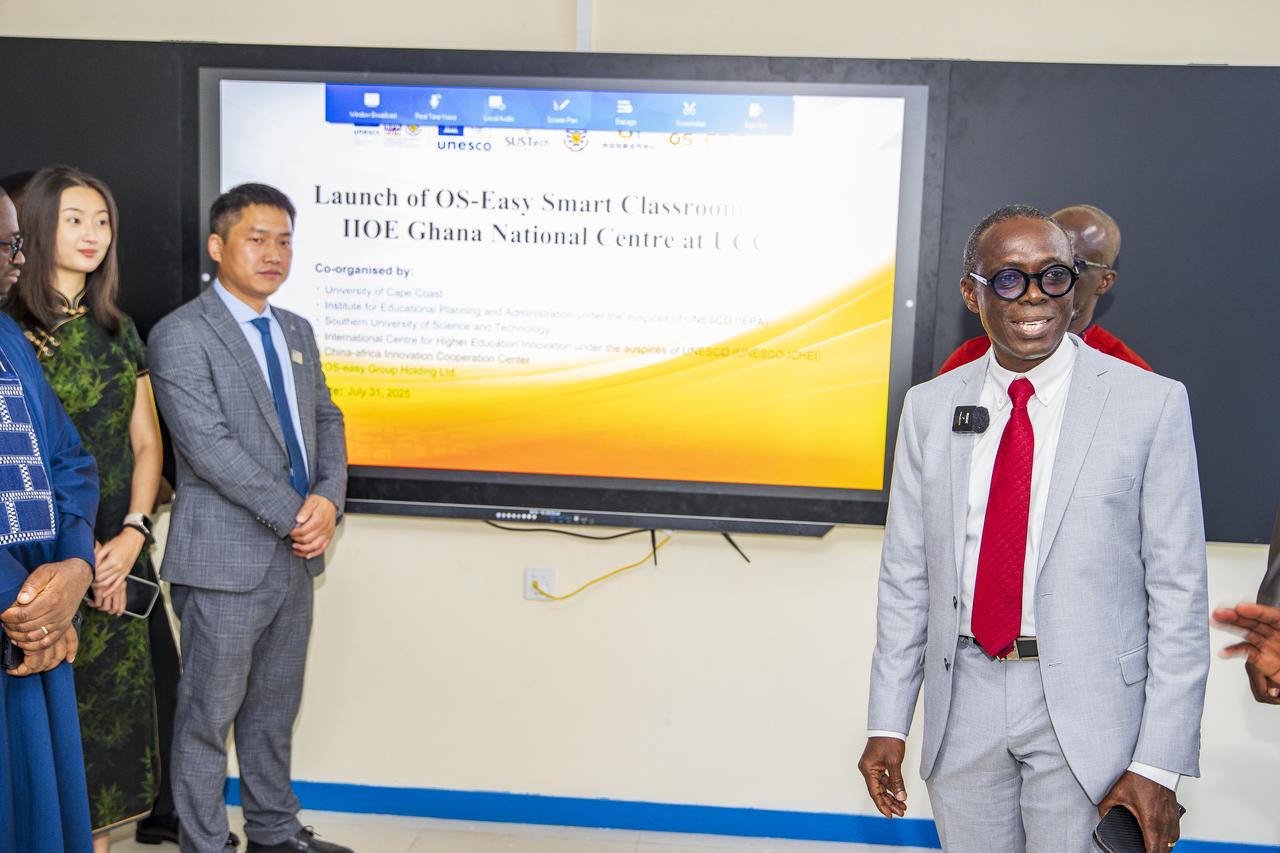 On July 31, 2025, the Smart Classroom jointly established by the International Centre for Higher Education Innovation under the auspices of UNESCO (hereinafter referred to as "UNESCO-ICHEI"), Southern University of Science and Technology (SUSTech), the University of Cape Coast (UCC), the Institute for Educational Planning and Administration under the auspices of UNESCO (IEPA), and Wuhan OS-EASY GROUP HOLDING LTD. (hereinafter referred to as "OS-EASY") was officially inaugurated at the University of Cape Coast. On the same day, the Ghana National Centre of the International Institute of Online Education (IIOE) was formally launched, becoming the 13th National Centre established globally by IIOE in collaboration with partner institutions. The event brought together over 400 participants, including government representatives, university presidents, international partners, faculty, and students.