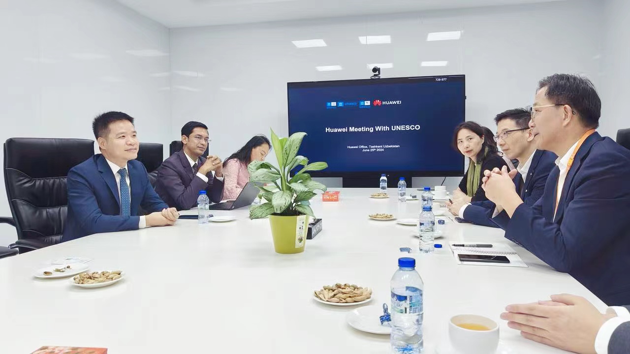 On June 25, led by Professor LIANG Jiansheng, the delegation of UNESCO-ICHEI visited Huawei Tashkent office and E-LINE PRESS and PROINFO LLC, local enterprises in Uzbekistan. When visiting the Huawei Tashkent office, Mr. SUN Huan, Vice President, ME CA, EBG, Huawei, extended warm welcome to the delegation of UNESCO-ICHEI, and briefly introduced the mission and major programmes of the Huawei Tashkent office. He pointed out that Huawei's Tashkent office is committed to promoting digitalization in various fields of Uzbekistan's society, cultivating young talents, and protecting the ecological environment. During the COVID-19 epidemic, Huawei Tashkent office provided technical support to Uzbekistan in fields such as distance education and medical assistance. Professor LIANG Jiansheng, Executive Deputy Director of UNESCO-ICHEI, expressed gratitude for the warm reception of Huawei Tashkent office. Both sides exchanged ideas on digitalization of higher education and expressed their expectations for future cooperation.