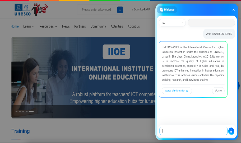 In 2023, the number of IIOE partner enterprises has increased from 22 to 30. In the first half of the year, UNESCO-ICHEI signed agreements with four partner enterprises: Jiangxi KMAX, ZhiXueYun, OS-EASY, and Baidu. The collaboration with KMAX involved VR/AR hardware and course development. Pilot projects for VR course training were initiated in universities in Nigeria, Mongolia, and Pakistan. In collaboration with ZhiXueYun, UNESCO-ICHEI upgraded the IIOE learning platform and introduced IIOE 3.0-iTA (Intelligent Teaching Assistant).