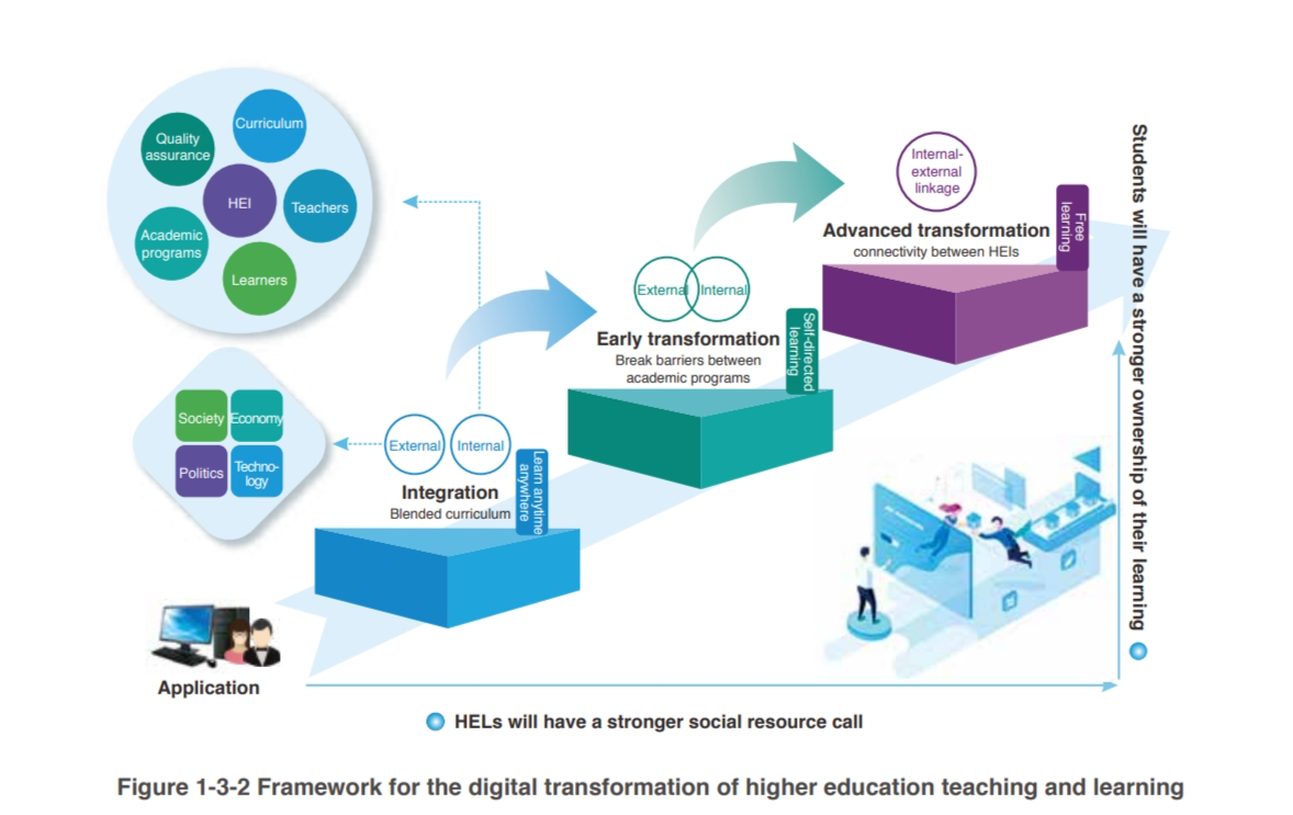 Based on readiness in applying digital technologies to education, the digital transformation of education comprises three stages: integration of digital technologies and teaching, early transformation, and advanced transformation. In the stage of integration of digital technologies and teaching, where curriculum development and delivery will not be limited by time or space, the core elements such as teaching objectives, contents, activities, assessments, and environment will be reshaped and reorganized by the integration of physical and virtual spaces. At this stage, students will enjoy more flexible learning by blending online and offline methods and HEIs will expand Internet-based teaching to promote educational reform towards blended teaching. In the stage of early transformation, HEIs will gain access to external resources for curriculum development, such as those from other HEIs, relevant enterprises and social organizations. At this stage, HEIs will develop individualized curriculum designs with a flexible combination of course modules from different schools and academic programs to meet diverse needs of students. In the stage of advanced transformation, digital technologies will completely break boundaries between HEIs, enabling connectivity between HEIs, between HEIs and society, between HEIs and enterprises, and between HEIs and other stakeholders. By that time, the sharing of academic programs, curriculum, teachers, facilities, and services will become possible, and educational resources of the whole society will be fully utilized. —— Research Report on Digital Transformation of Higher Education Teaching and Learning