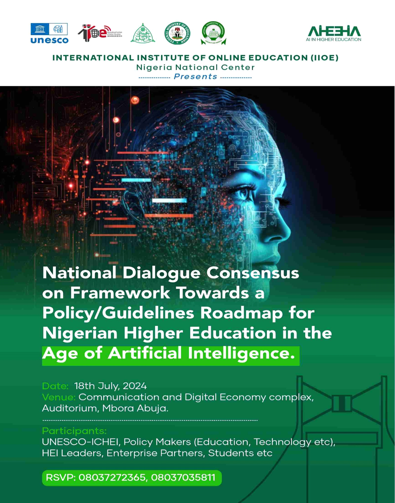 The rapid advancement of AI technology is reshaping the field of higher education, transforming teaching, learning, and research activities, and having a "disruptive" impact in the post-pandemic era. To responsibly and safely use AI and generative AI technologies in education, International Centre for Higher Education Innovation under the auspices of UNESCO (UNESCO-ICHEI) and the 2024 International Institute of Online Education (IIOE) rotating presidency unit, Ahmadu Bello University, Zaria, will hold a National Policy Dialogue on July 18 in Abuja, Nigeria. The theme of this conference is "Building a Consensus Framework for the AI Era: Developing a Higher Education Policy Roadmap for Nigeria". It focuses on policy/guidelines formulation, infrastructure development, professional development for teachers, and educational equity and inclusion. The aim is to assist decision-makers, educators, learners, and researchers in better leveraging the advantages of AI technology to empower the digital transformation of higher education.