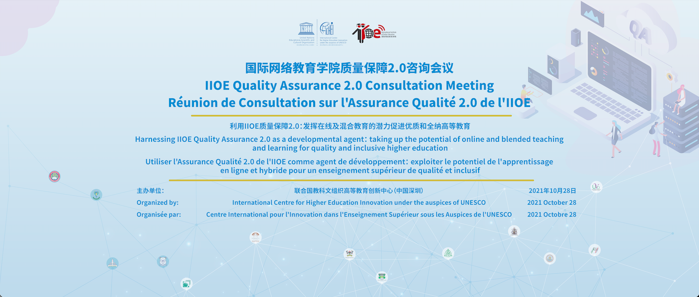 The International Institute of Online Education (IIOE) Quality Assurance 2.0 Consultation Meeting was successfully held on October 28th,2021. The conference was organized by the International Centre for Higher Education Innovation under the auspices of UNESCO (Shenzhen, China) (hereinafter referred to as the "UNESCO-ICHEI").