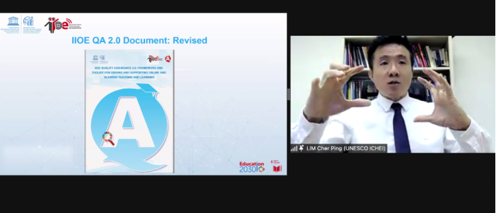 Professor LIM Cher Ping, Chief Expert of IIOE and Chair Professor of The Education University of Hong Kong, introduced the framework, toolkit and implementation mechanism of IIOE Quality Assurance 2.0. According to Professor LIM, UNESCO-ICHEI summarized the practical experience of IIOE partner HEIs in applying IIOE Quality Assurance 1.0 based on the launch of IIOE Quality Assurance 1.0 in December 2019. He also outlined the operationalisation of IIOE QA 2.0 on institutional, programme and course levels. He then summarised feedback from IIOE partner HEIs regarding IIOE Quality Assurance 2.0, and emphasised the importance of working closely with IIOE partner HEIs. He further pointed out that IIOE QA 2.0 needs to be constantly revised according to the needs of partner HEIs, and the need for contextualisation and localization according to regional specificities.