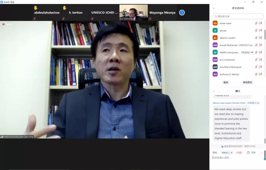 Ms Stefania Giannini, UNESCO Assistant Director-General for Education, Dr. Ayman Ashour, Deputy Minister of Higher Education and Scientific Research of Egypt and Ms Maki Katsuno-Hayashikawa, Director for the Education 2030 Division of UNESCO attended the meeting and delivered speeches. Prof. LI Ming, Director of UNESCO-ICHEI, Prof. LIM Cher Ping, Chief Expert of International Institute of Online Education (IIOE) and Chair Professor at the Education University of Hong Kong, Ms. BI Xiaohan, Chief of West Asia and Africa Programme Office, Ms. ZENG Bingran, Chief of Knowledge Production and Communications Centre, Dr. ANDOH Hoba, Senior Education Specialist and Mr. CHEN Dean, Programme Officer of West Asia and Africa Programme Office also attended the meeting.