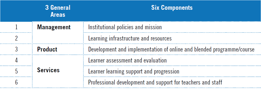 IIOE self-assessment tool consists of 6 components, 20sub-components and and 61 measurement areas. Asian and African HEIs could use the IIOE QA self-assessment tool to make a comprehensive assessment of their institution’s performance in online and blended teaching and learning. At the end of the assessment, there will be a self-assessment report that could provide advice and recommendations on how institutions might improve on online and blended teaching and learning.