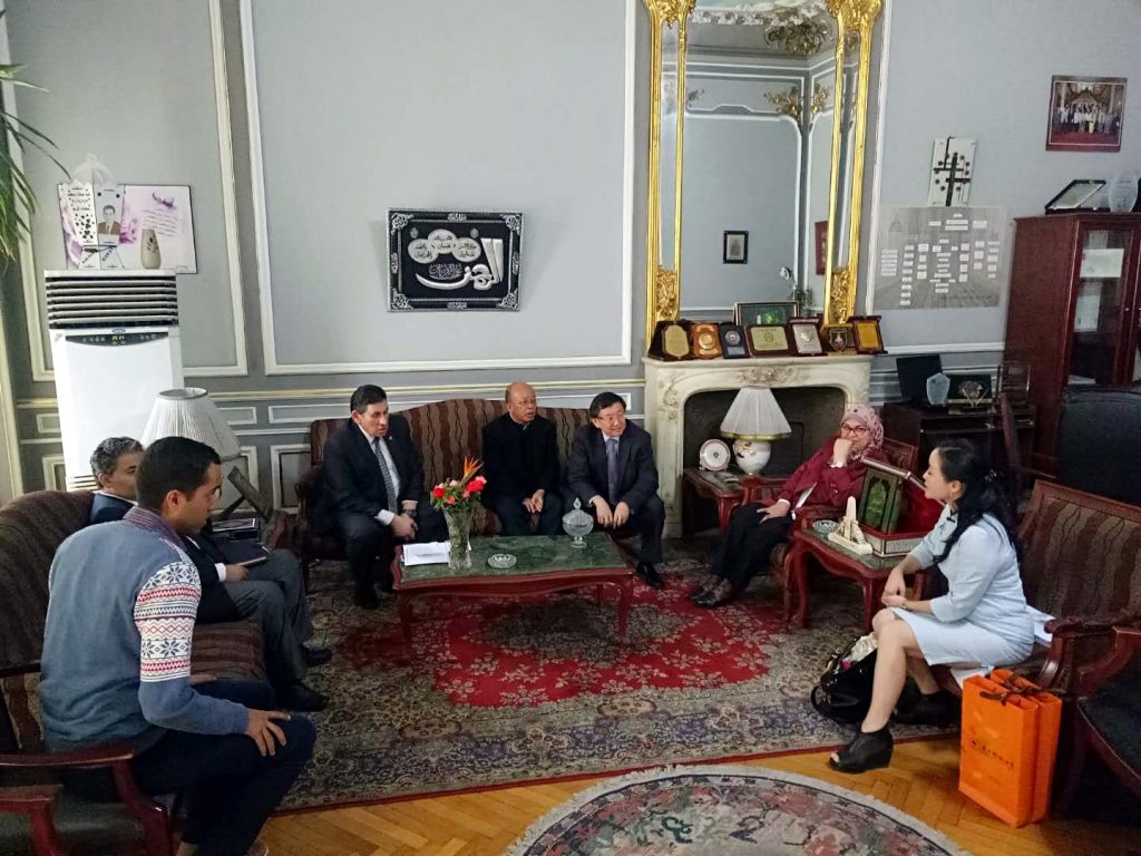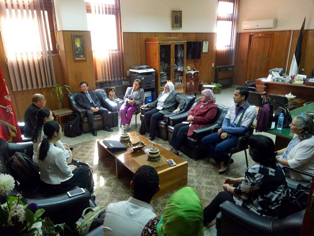 13-15 November 2017, UNESCO-ICHEI and the Center for Higher Education Research (CHER) of Southern University of Science and Technology (SUSTech), China, arranged an expert delegation to Ain Shams University (ASU). It is the first academic exchange activity after UNESCO-ICHEI and SUSTech started to implement "One Belt One Road Educational Collaboration Programme" with the universities along the Maritime Silk Road. The members of the First Delegation were: Professor CHEN Yuehong, Director of the Humanities Center, SUSTech, Professor RONG Yiming, Department Chair of the Department of Mechanical and Energy Engineering, SUSTech, and Dr. MA Jinyuan, Chief of the Research Office of UNESCO-ICHEI.After a meeting with Professor Mona Hassan, Dean of the Faculty of Al-Alsun (Languages), and directors of the Chinese Department of ASU, Prof. CHEN delivered a lecture on "The Narrative Features of Chinese Classical Novels and Chinese People's Outlook on Life" at the Chinese Department of ASU. The lecture was warmly welcomed by the students and faculty members. Professor Mona Hassan and four directors of the Chinese Department of ASU attended the lecture.