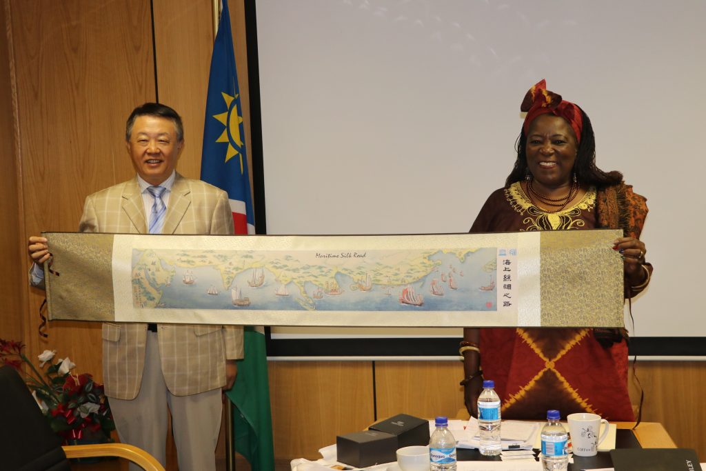 Professor LI Ming presented Scroll Painting of Maritime Silk Road to Namibia Ministry of Higher Education, Training and Innovation