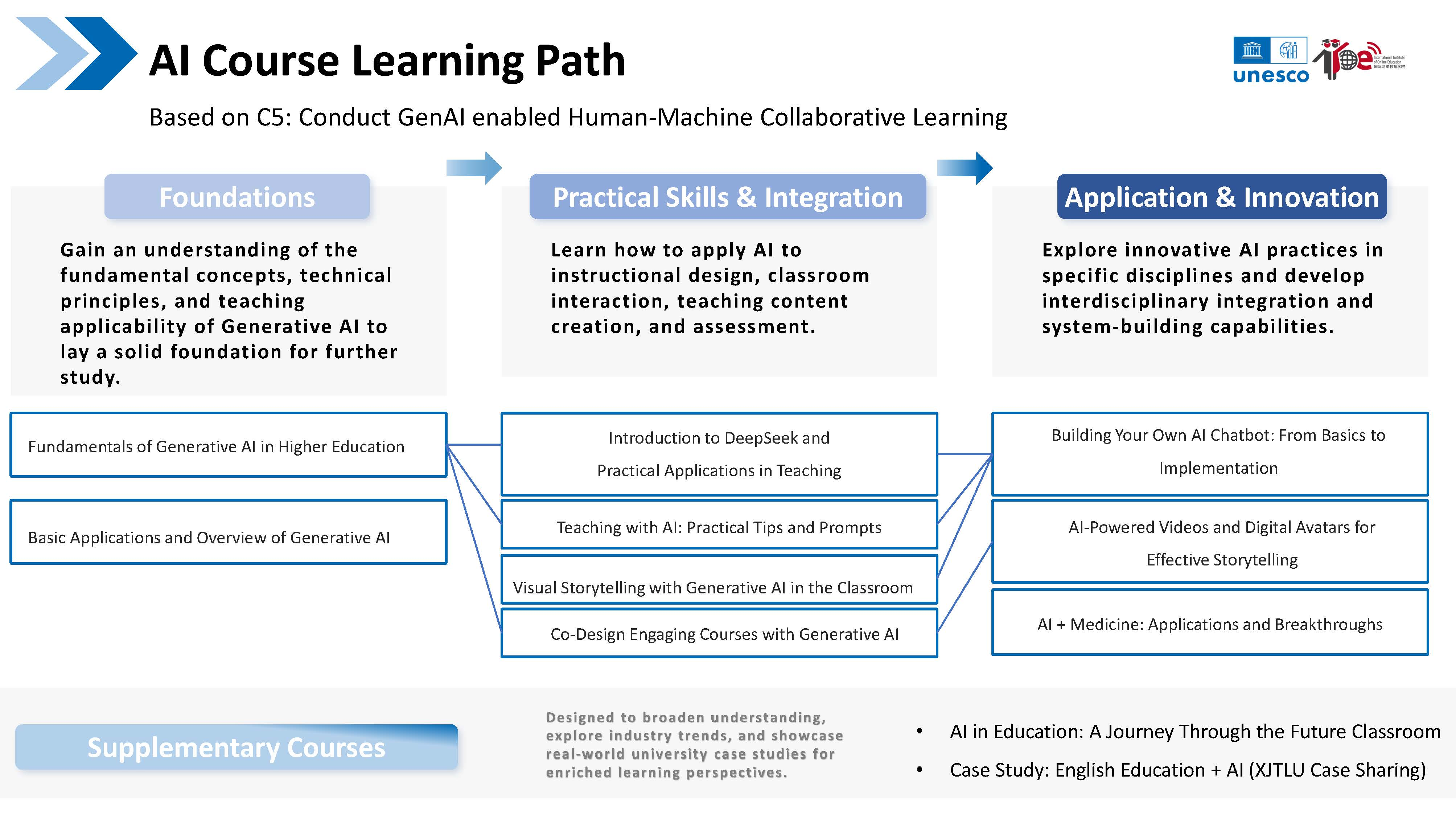 سلسلة دورات "الذكاء الاصطناعي + التخصص" وسبل التعلمسيواصل IIOE في عام 2025 تعزيز سلسلة دورات "الذكاء الاصطناعي + التخصص"، وسيعمل عبر التركيز على سيناريوهات التطبيق العملية والابتكار في مجالات محددة على استكشاف طرق الدمج متعدد التخصصات للذكاء الاصطناعي بشكل معمق. كما أن IIOE صمم بدقة مسارات تعليمية مخصصة للذكاء الاصطناعي تشمل: محور أساسيات الذكاء الاصطناعي (يشمل المفاهيم الأساسية والمبادئ التقنية)؛ محور مهارات التطبيق العملي للذكاء الاصطناعي (يشمل التدريب التقني وطرق الدمج)؛ محور الابتكار في تطبيقات الذكاء الاصطناعي (يشمل الدمج متعدد التخصصات وبناء الأنظمة). وتهدف هذه المسارات إلى تمكين المتعلمين بشكل منهجي لبناء نظام متكامل من القدرات من النظري إلى التطبيقي ومن التقني إلى الابتكار.