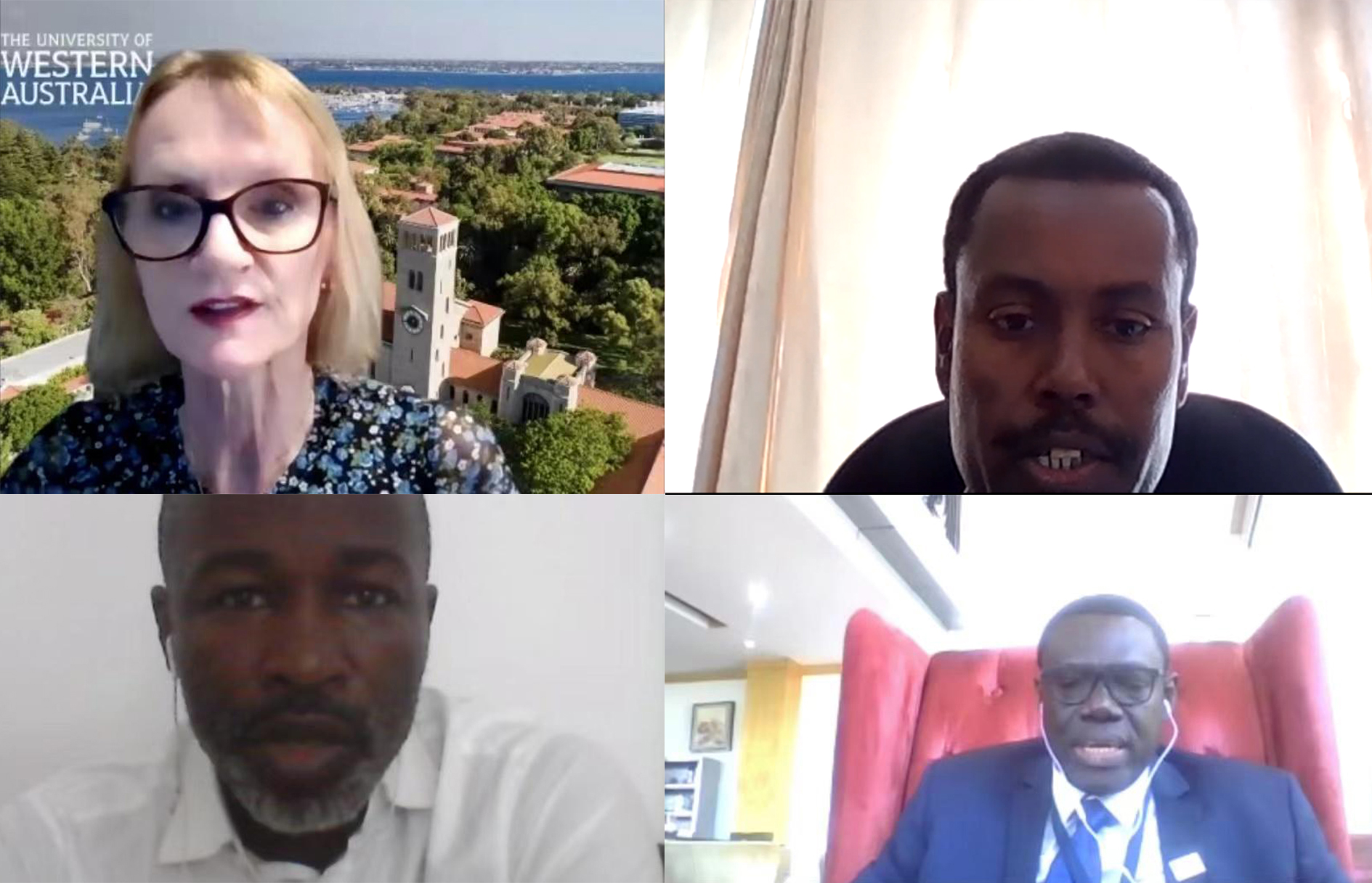Dr. Grace Oakley, Associate Dean of College of Education, University of Western Australia (Top left); Dr. Clément Lobo, Deputy Director of Techno-pedagogy, Virtual University of Côte d'Ivoire (Bottom left); Dr. Mulat Asnake, Director of Continuing and Distance Education Office, Addis Ababa University (Top right); Dr. Abdoulaye Salifou, Chief of Education, UNESCO Liaison Office to African Union and United Nations Economic Commission for Africa (Bottom right)
