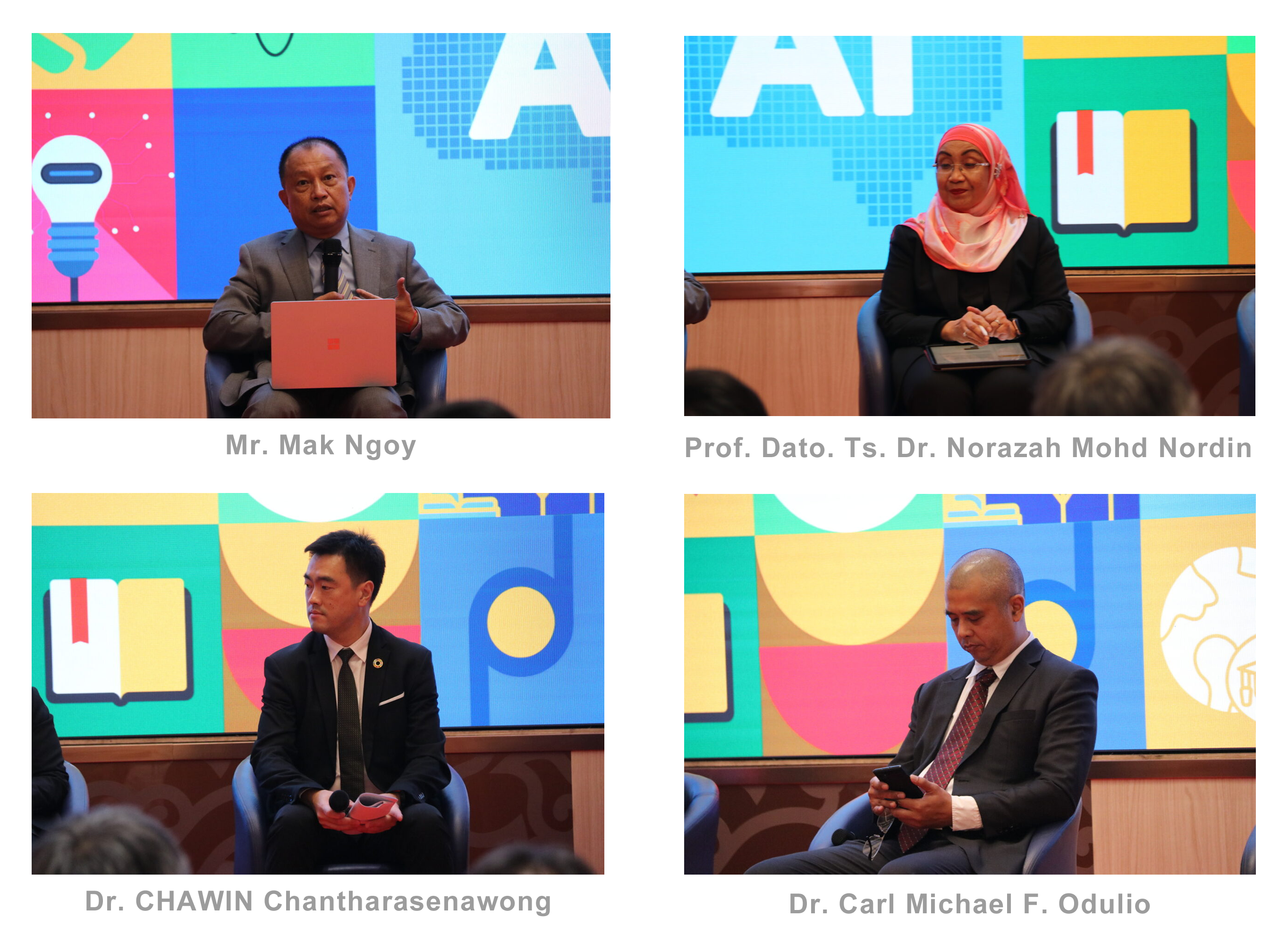 In the roundtable discussion session, six experts shared initiatives and projects at the national or institutional level to enhance teaching and learning. Dr. Sean McMINN, Director of the Center for Education Innovation, Hong Kong University of Science and Technology, China, highlighted AI literacy for students, faculty AI readiness, and improved regional collaboration through AI governance at the institution and government scenarios. Dr. Husaina Banu Kenayathulla, Associate Professor, Department of Educational Management, Planning and Policy, University of Malaya, Malaysia, shared the AI Literacy Programme for Everyone initiated by the Malaysian government and guidelines for students to use ChatGPT at the institutional level. Dr. Nur Afny Catur Andryani, Associate Professor, AI Data Science Enthusiasts Department, Bina Nusantara University, Indonesia, recognised the immense potential of AI and elaborated on her insights regarding the AI blueprint designed to facilitate AI integration in higher education. Mr. Marc Lepage, Principal IT Specialist (Technology Innovation), ADB, shared their initiatives under the umbrella term "digital leadership", linking climate change with innovative teaching at the university. Mr. Joe ZHOU, Southeast Asia Director of MAXHUB/Seewo, introduced Seewo's Industrial Solutions, concentrating on the development of digital terminals, primarily Interactive Blackboards, which aim at data collection, advancing GenAI, and enhancing public accessibility. Prof. Hong T.M. Bui, Director of Research, Innovation Enterprise and Professor of Business Education at Birmingham City Business School, emphasised the importance of not only advancing technology but also enhancing teaching personnel' AI competencies, exemplified by her recent project.