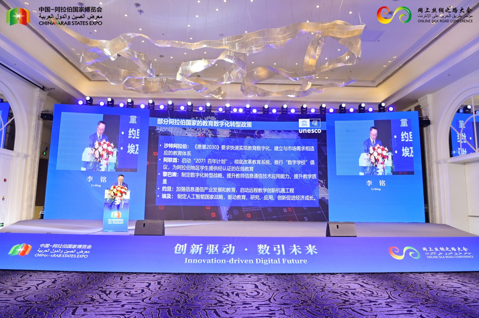 On September 24, the four-day Sixth China-Arab States Expo (hereinafter as “the Expo”) successfully concluded in Yinchuan, Ningxia. Prof. Li Ming, Director of International Centre for Higher Education Innovation under the auspices of UNESCO (hereinafter as “UNESCO-ICHEI”), was invited to attend and deliver a keynote speech titled "New Areas of Cooperation between China-Arab States through Digital Transformation of Higher Education" at the opening ceremony of Online Silk Road Conference on September 21st. He was also invited by Ningxia University to the unveiling ceremony of China-Arab University Alliance Exchange Mechanism Research Institute on September 22nd. Mr. Sit Fung, Chief of International Institute of Online Education Management Centre (herein after as "the IIOE Management Centre), and Ms. Su Rui, Deputy Chief of the office, accompanied.